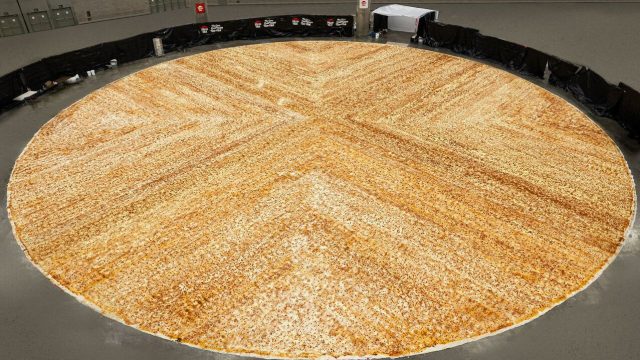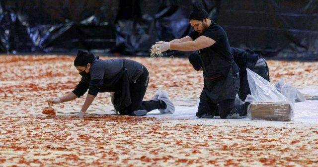 Një kohë e arsyeshme, po të mendosh se janë përdorur 6 tonelata brumë, më shumë se 2 tonelata salcë domateje, 4 tonelata djathë dhe më shumë se 630 mijë feta sallami.