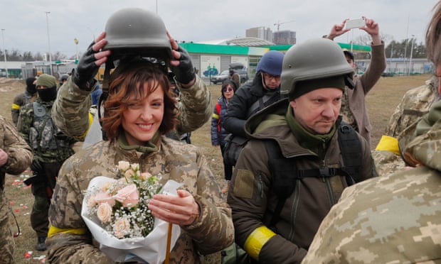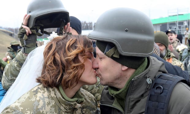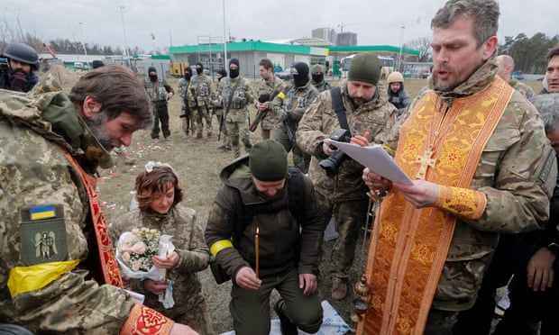 Anëtarët e Forcave të Mbrojtjes Territoriale të Ukrainës, Lesia Ivashchenko dhe Valerii Fylymonov, janë fotografuar gjatë ceremonisë së tyre të dasmës më 6 mars./The Guardian/ /arbresh.info/