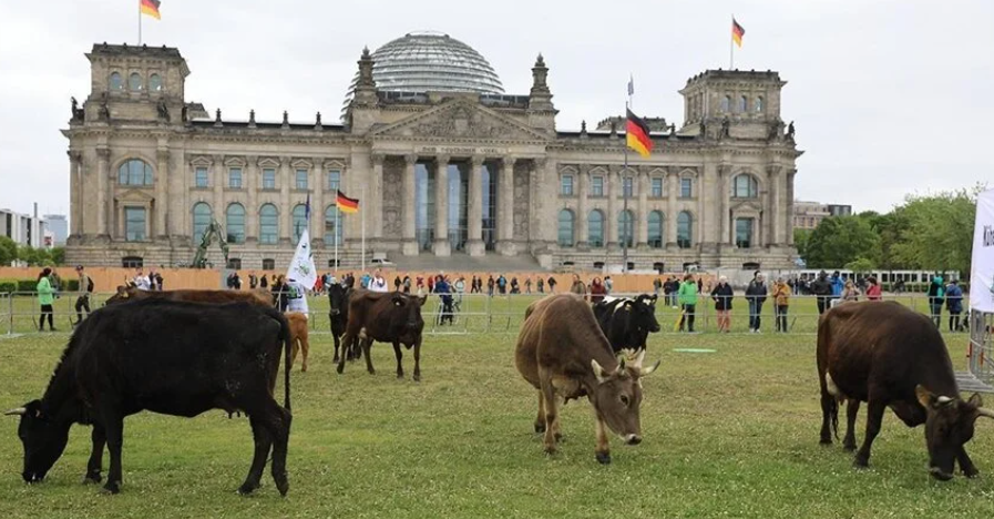 Organizata ambientaliste “Greenpeace” dhe Grupi i Punës për Bujqësinë Rurale (AbL) sollën tufë lopësh në zonën me bar përpara ndërtesës së Bundestagut gjerman në kryeqytetin Berlin për të protestuar kundër mbajtjes së lopëve në stalla.