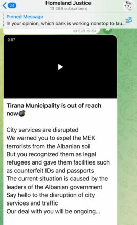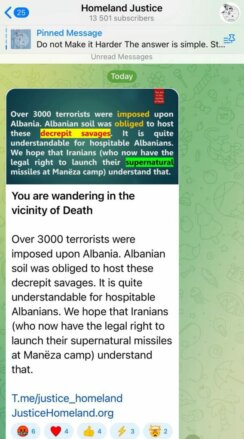 Duke marrë shkas nga konflikti mes Iranit dhe Izraelit, që nisi të premten e kaluar, “Homeland Justice” ka publikuar një mesazh kërcënues që lidhet me rolin e Shqipërisë në strehimin e anëtarëve të organizatës së Muxhahedinëve, të vendosur në kampin e Manzës.
