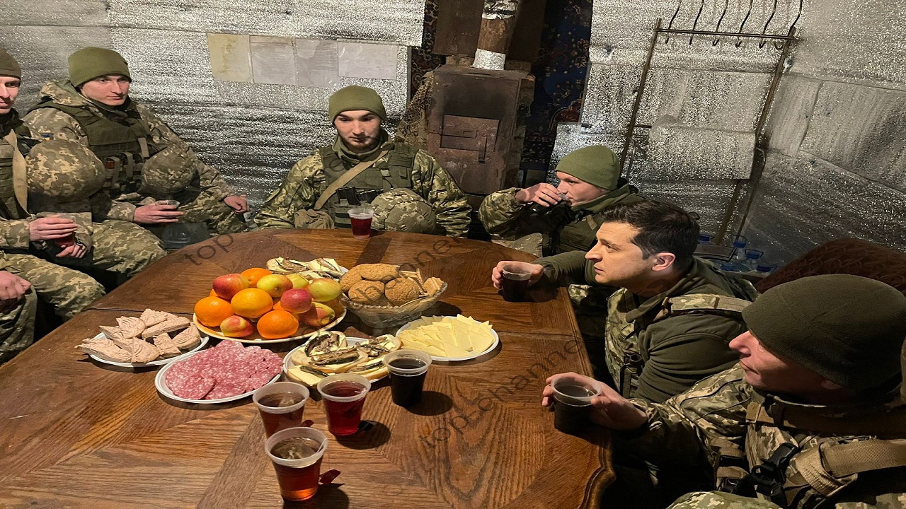 Kjo foto e siguruar nga Top Channel tregon presidentin Zelensky në një bazë ushtarake, ku është takuar me një grup ushtarësh duke folur për situatën dhe duke pirë çaj.