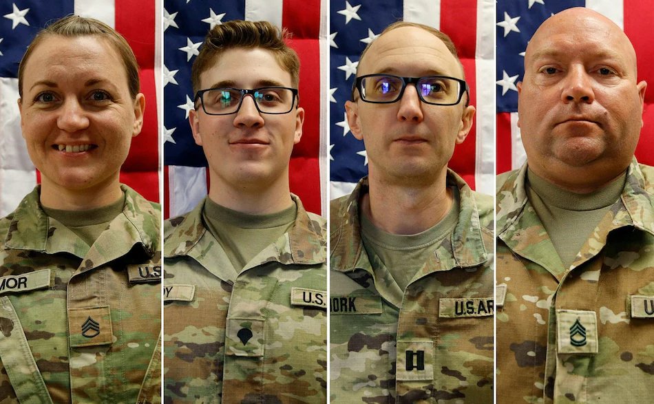 Të rënët janë identifikuar si, Kapiten Cody Khork, 35 vjeç, nga Lakeland, Florida; Rreshter i Klasit të Parë Nicole Amor, 39 vjeç, nga White Bear Lake, Minnesota; Rreshter i Klasit të Parë Noah Tietjens, 42 vjeç, nga Bellevue, Nebraska; dhe Rreshter Declan Coady, 20 vjeç, nga Des Moines, Iowa.