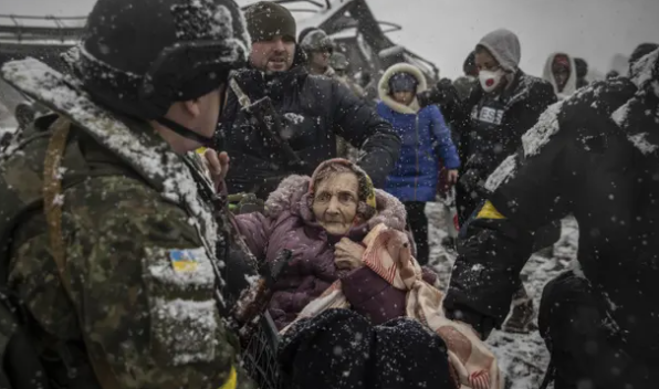 Oficerët evakuojnë një grua të moshuar ndërsa civilët vazhdojnë të ikin nga Irpin për shkak të sulmeve të vazhdueshme ruse.