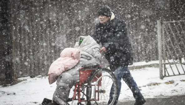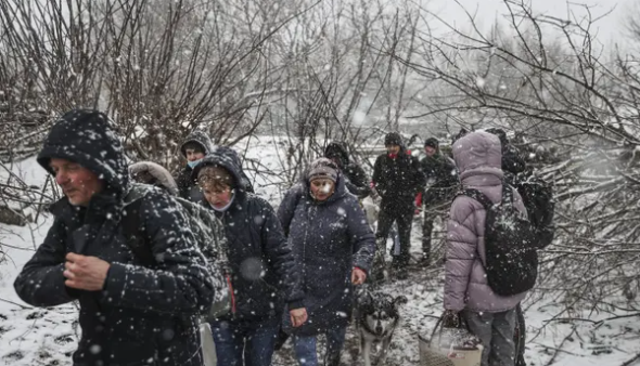 Kolonat e civilëve duke ikur nga Irpin ndërsa bora është duke rënë.