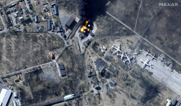 Më poshtë është një imazh i një zjarri në aeroportin Antonov në Hostomel, Ukrainë.