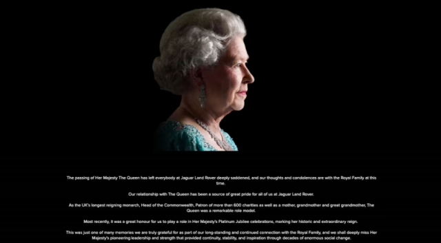 Të dyja Jaguar dhe Land Rover (JLR) shfaqin gjithashtu një version me të njëjtin mesazh, me një portret të Mbretëreshës Elizabeth II dhe me mesazhin: “Marrëdhënia jonë me Mbretëreshën ka qenë një burim krenarie për të gjithë ne tek Jaguar Land Rover”.