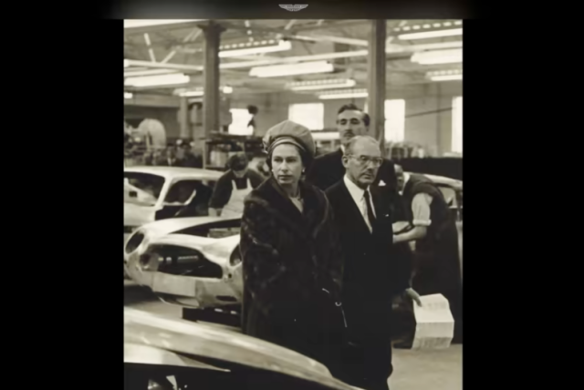 Ndërkohë, Aston Martin ka një fotografi të Mbretëreshës në katin e fabrikës së Aston Martin gjatë një turneu në vitin 1966.