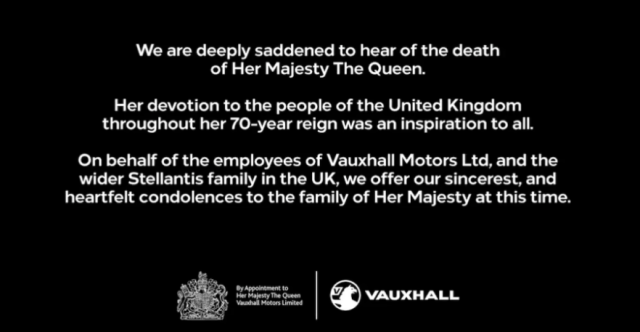 Homazhi i bërë nga Vauxhall është një mesazh i thjeshtë me tekst të bardhë dhe sfond të zi, dhe përfshin Garantimin Mbretëror të markës, një “shenjë njohjeje” e dhënë nga Madhëria e Saj, Mbretëresha.