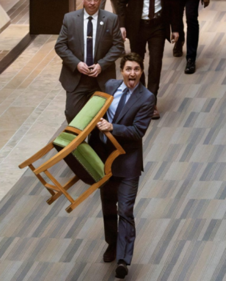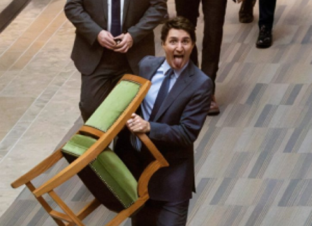 Teksa doli nga Dhoma e Komunave të hënën, pas zgjedhjes së pasardhësit të tij një ditë më parë, kryeministri në largim i Kanadasë mori karrigen e tij të Parlamentit, e mbajti me vete dhe nxori gjuhën jashtë në një moment që nuk u shpëtoi fotografëve.