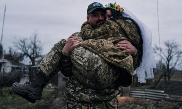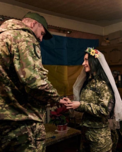 Ajo iu bashkua përpjekjeve të luftës kundër “operacionit special ushtarak” të Vladimir Putin në Mars dhe tha se kishte një plumb për presidentin rus. Por pavarësisht fluturimit të raketave dhe kërcënimit me vdekje, 35-vjeçarja u martua në vijën e frontit javën e kaluar.