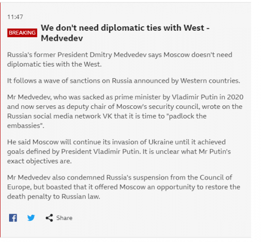 Medvedev, i cili u shkarkua nga posti i kryeministrit nga Vladimir Putin në vitin 2020 dhe tani shërben si kryetar i këshillit të sigurisë të Moskës, shkroi në rrjetin rus të mediave sociale “VK” se është koha për të “bllokuar ambasadat”, shkruan BBC.