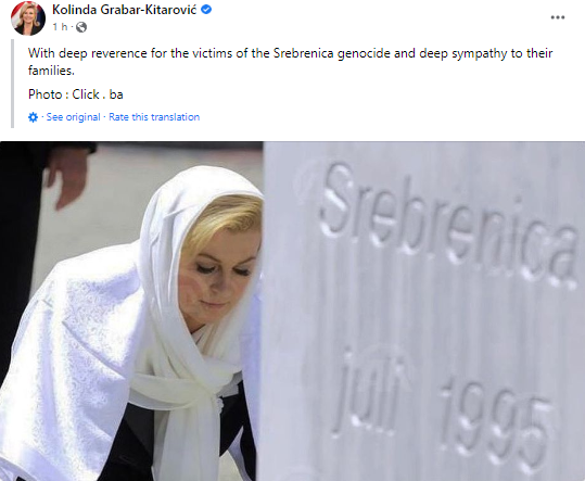 “Me nderim të thellë për viktimat e gjenocidit në Srebrenicë dhe simpati të thellë për familjet e tyre”, ka shkruar Grabar-Kitarović në Facebook.