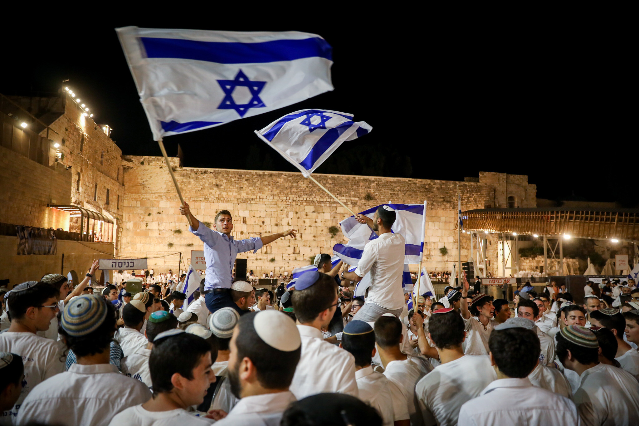Jewish men dance with Israeli flags at the Western Wall in Jerusalem Old City on the eve of Jerusalem Day, May 28, 2022. Photo by Noam Revkin Fenton/Flash90 *** Local Caption *** כותל יום ירושלים דגל ישראלי אלפים תפילה בוקר שחרית טלית טליות