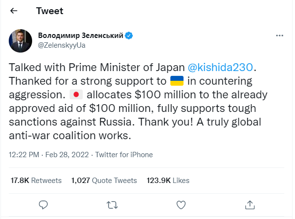 Ndërkaq kryeministri Japonez po ashtu përmes llogarisë së tij në Twitter tha se “Japonia deklaron mbështetje të vendosur për sovranitetin dhe integritetin territorial të Ukrainës dhe qëndron së bashku me qytetarët e Ukrainës, të cilët po bëjnë maksimumin për të ndërmarrë veprime për të mbrojtur atdheun dhe familjet e tyre”. /arbresh.info/