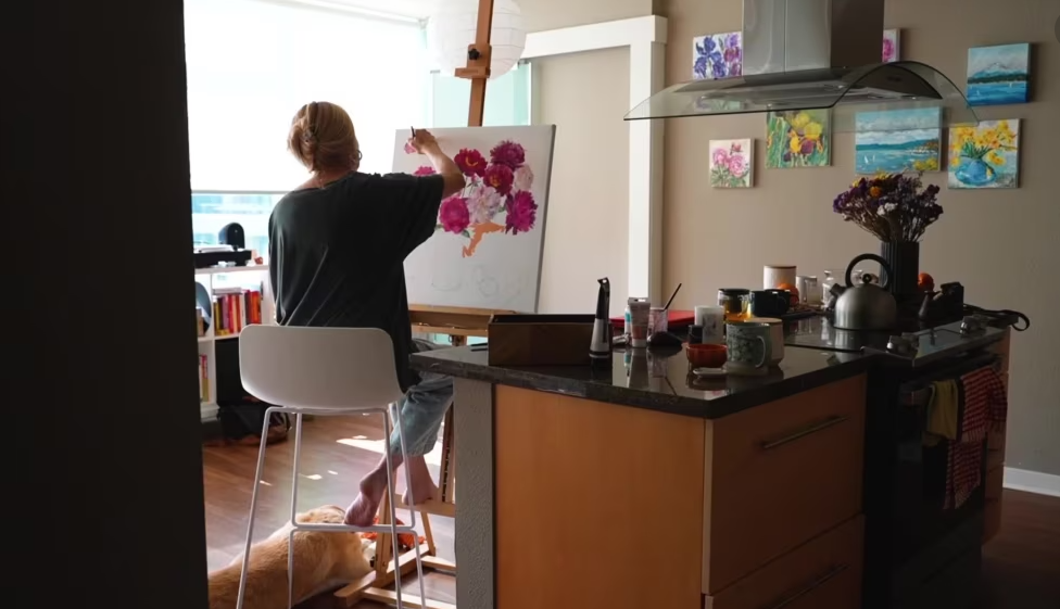 Victoria Nikitina po pikturon në shtëpinë e saj në Sietëll. Pas pak, Victoria, me prejardhje nga qyteti Dnipro i Ukrainës, do të lërë penelat mënjanë dhe do të niset drejt vendit të saj të punës.