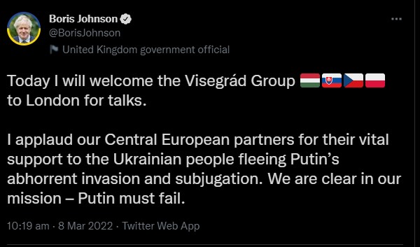 “Sot do të mirëpres Grupin e Vishegradit ???????? në Londër për bisedime. Unë përshëndes partnerët tanë të Evropës Qendrore për mbështetjen e tyre jetike për popullin ukrainas që ikën nga pushtimi dhe nënshtrimi i neveritshëm i Putinit. Ne jemi të qartë në misionin tonë – Putini duhet të dështojë”, ka shkuar ai./arbresh.info/