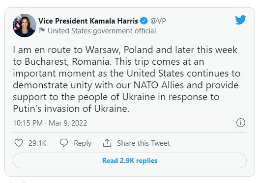 “Unë jam rrugës për në Varshavë, Poloni dhe më vonë këtë javë për në Bukuresht, Rumani. Ky udhëtim vjen në një moment të rëndësishëm pasi Shtetet e Bashkuara vazhdojnë të demonstrojnë unitet me aleatët tanë të NATO-s dhe të ofrojnë mbështetje për popullin e Ukrainës në përgjigje të pushtimit të Ukrainës nga Putini”, ka shkruar Harris.