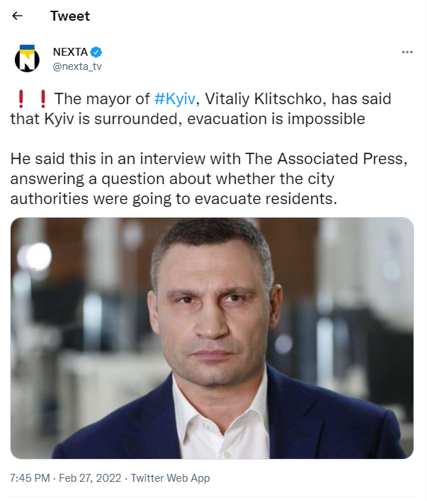 Ish-kampioni i botës në boks dhe kryetari i Kievit, Vitaliy Klitschko ka deklaruar se kryeqyteti ukrainas është i rrethuar dhe s’ka mundësi evakuimi.