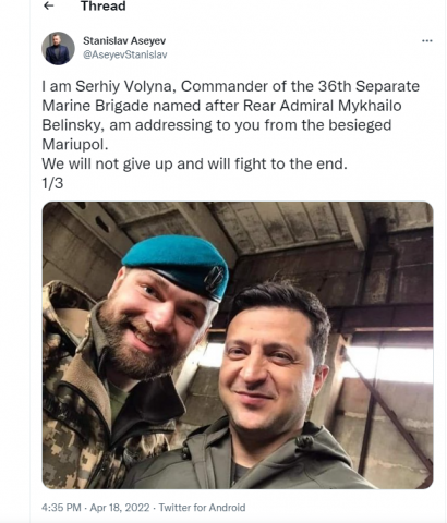 “Unë jam Serhiy Volyna, Komandanti i Brigadës së 36-të të Veçantë Detare me emrin e admiralit Mykhailo Belinsky, po ju drejtohem nga Mariupoli i rrethuar. Ne nuk do të dorëzohemi dhe do të luftojmë deri në fund”, shrkoi ai.