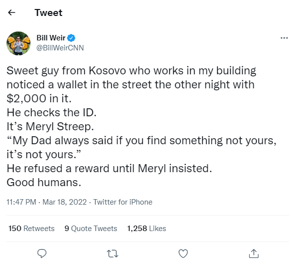“Një djalë i këndshëm nga Kosova, që punon në ndërtesën time, një natë ka gjetur një kuletë në rrugë me 2,000 dollarë brenda. Kontrolloi ID-në, ishte Meryl Streep”, ka shkruar Weir.