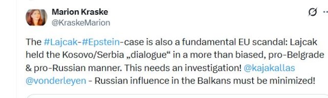 “Rasti Lajcak–Epstein është gjithashtu një skandal themelor i BE-së: Lajçak e ka zhvilluar “dialogun” Kosovë-Serbi në një mënyrë më shumë se të njëanshme, pro-Beogradit dhe pro-ruse. Kjo kërkon një hetim”, ka shkruar ajo në X.