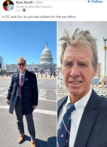 Në një postim në mars të vitit 2023, i njëjti profil në LinkedIn nxori dy fotografi, pa datë. Në njërën duket Routh përpara ndërtesës së Kongresit amerikan në Uashington dhe në tjetrën ai është në Sheshin e Pavarësisë në Kiev. Fotografitë mbajnë mbishkrimin: “Në DC dhe në Kiev për të siguruar ushtarë për luftë”.