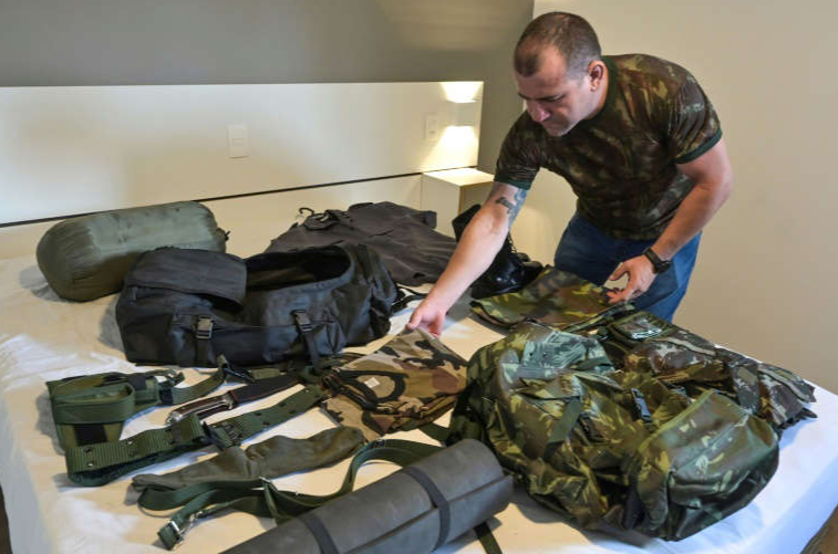 I veshur me një bluzë kamuflazhi që ngjitet në biceps, polici brazilian Saulo paketon çantën e tij me çizme luftarake, pajisje kampi, këllëf armësh dhe një thikë — “vetëm thelbësore” për të shkuar të luftojë në Ukrainë.