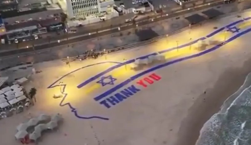 Një video që është shpërndarë masivisht në rrjete sociale, në një plazh në Tel Avivi është shkruhet “faleminderit” duke e shoqëruar mesazhin me një skicë të profilit të presidentit amerikan.