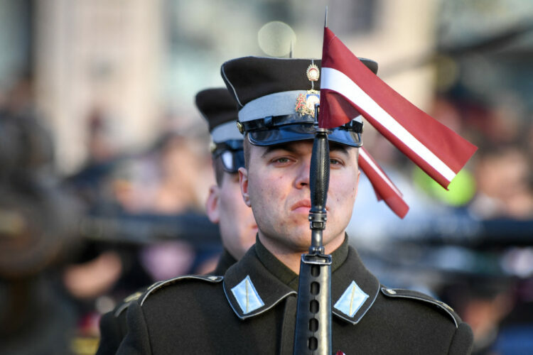 Latvian soldier takes part in a parade during a ceremony to mark 100 years of Latvia's independence in Riga, Latvia, November 18, 2018. (Photo by Ilmars Znotins / AFP)