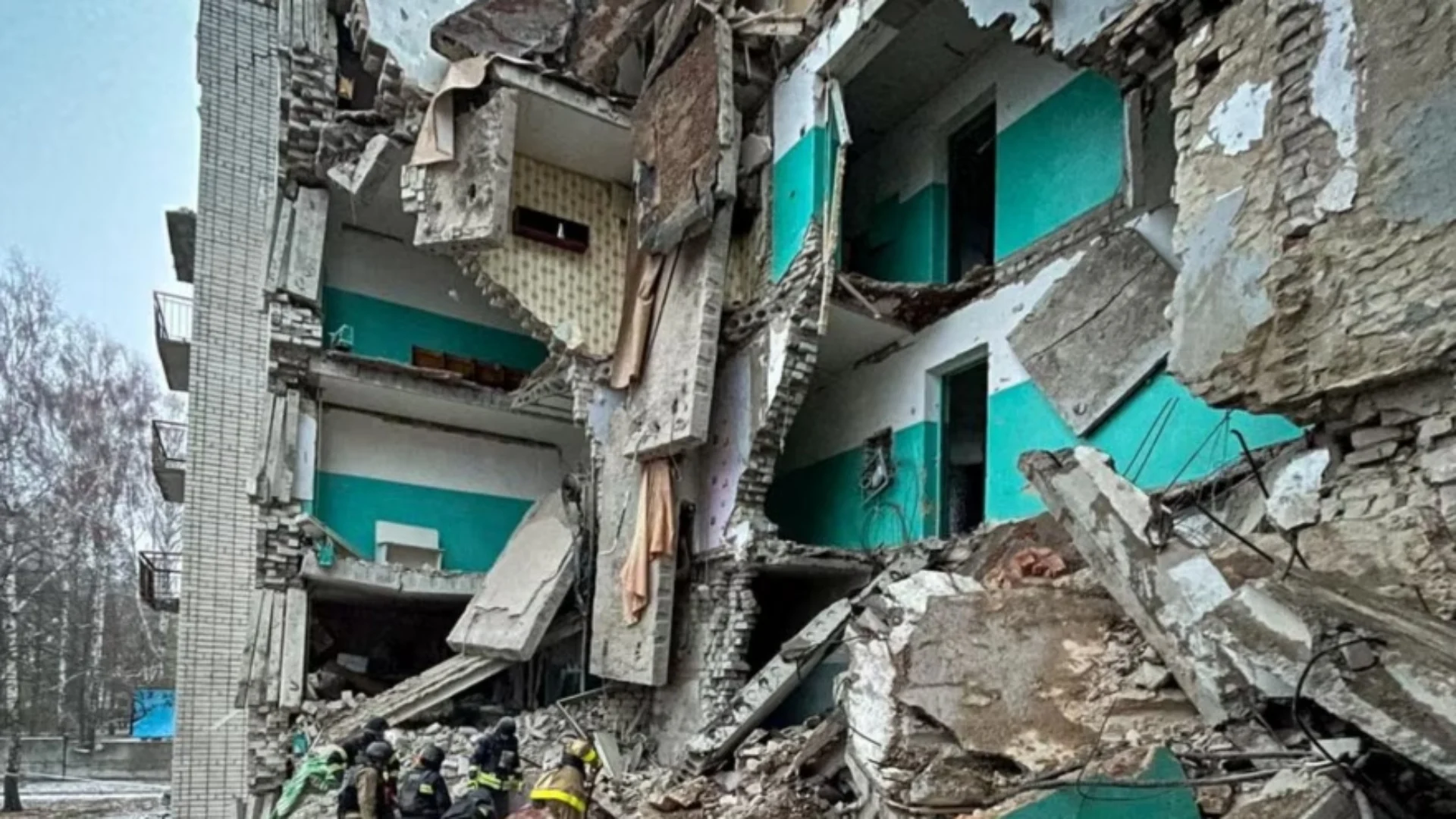 Një video e shpërndarë nga Zelensky shfaq ekipet emergjente duke kërkuar për të mbijetuar në gërmadhat e ndërtesës së shkatërruar pjesërisht.