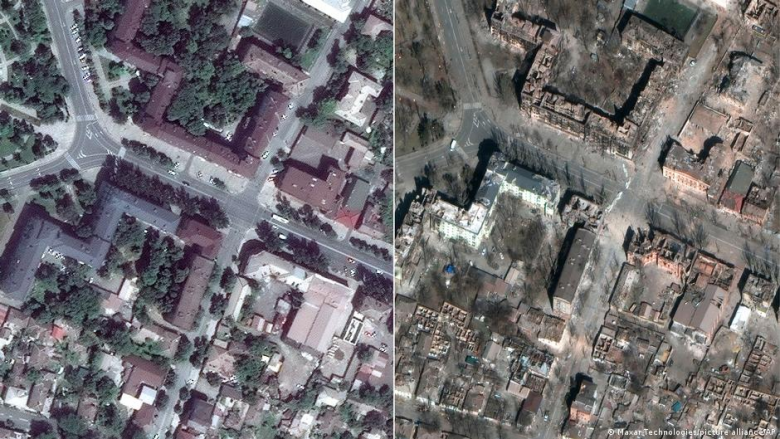 Pamjet rrëqethëse të Mariupolit dikur dhe tani i ka publikuar media angleze Telegraph. Një video e ngjashme është shfaqur në edhe në The New Voice of Ukraine, ku shihet se vendet që dikur ishte të gjelbëruara tani kanë marrë ngjyrë hiri nga copëzat e bombave ruse që kanë rënë.