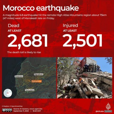 Sipas të dhënave më të fundit, të paktën 2681 persona kanë humbur jetën pas tërmetit me magnitudë 6.8 ballë të së premtes mbrëma dhe 2501 të tjerë janë plagosur rëndë, shkruan Al Jazeera.