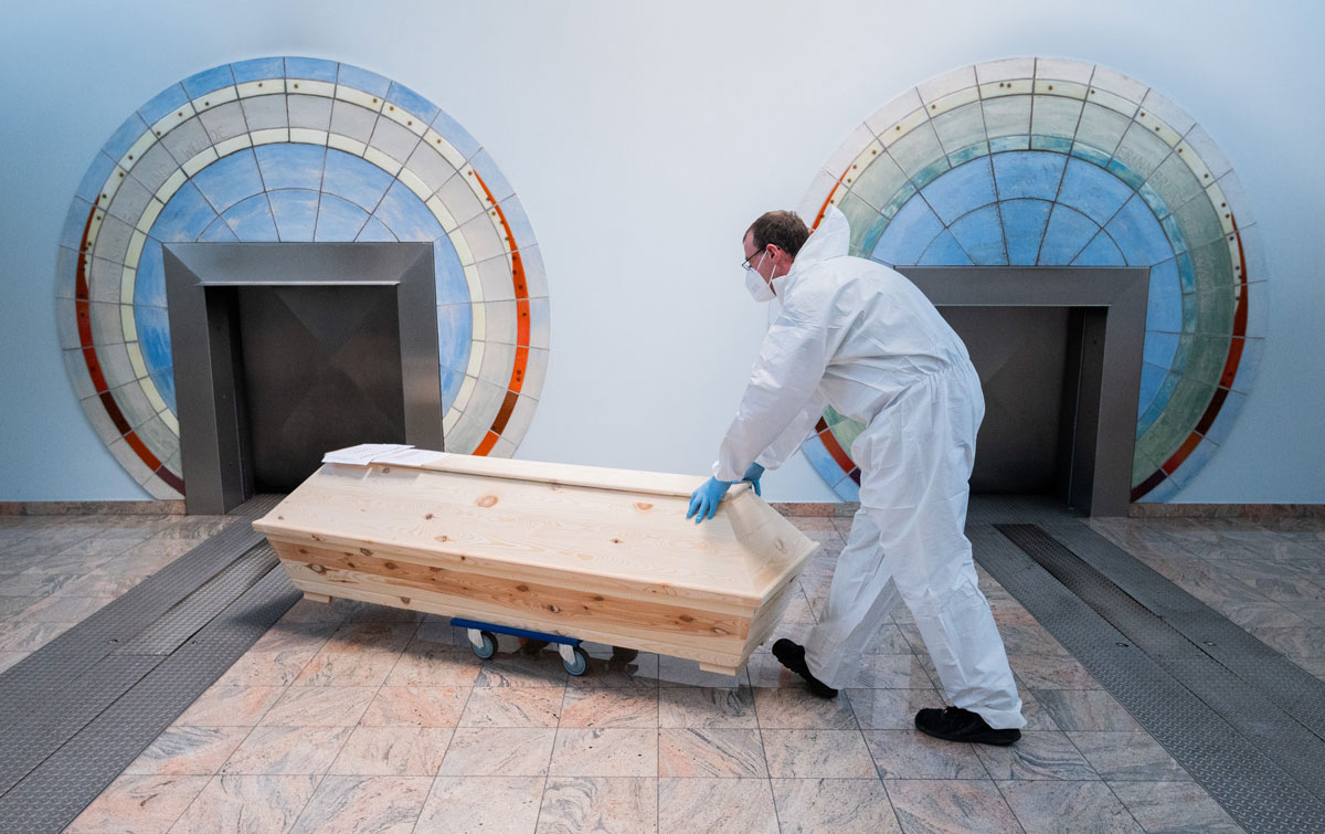28 April 2021, Lower Saxony, Giesen: Cremation technician Dirk Müller brings a deceased person in a coffin labelled "SARS-CoV-2 positive Corona" for cremation at the crematorium "Die Feuerbestattungen Hildesheim". More than 5200 people in Lower Saxony have died in connection with Corona since the beginning of the pandemic - but their numbers are rising more slowly. Photo: Julian Stratenschulte/dpa (Photo by Julian Stratenschulte/picture alliance via Getty Images)