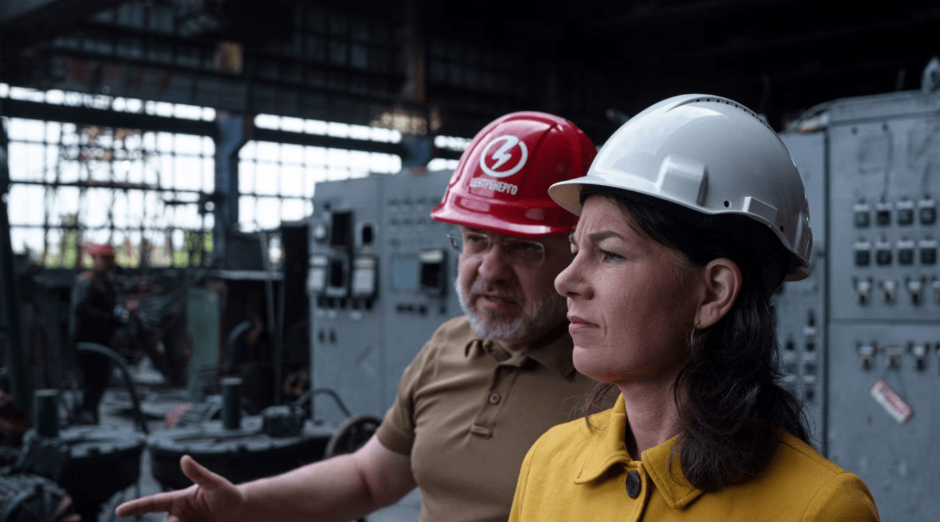 Zonja Baerbock, e shoqëruar nga ministri ukrainas për Energjetikën Herman Halushchenko, vizitoi një termocentral në Ukrainën qendrore që u dëmtua rëndë në 11 prill. Brenda mjediseve të shkrumbuara të centralit, punonjësit e kompanisë shtetërore Centrenergo që menaxhon termocentralin, vazhdonin të hiqnin rrënojat megjithëse kanë kaluar disa javë nga sulmi.