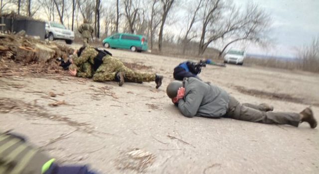Ministri i Brendshëm i Ukrainës u detyrua ulej ne toke për t’u mbrojtur gjatë një vizite në vijën e parë të konfliktit tetë-vjeçar me separatistët pro-rusë të shtunën.