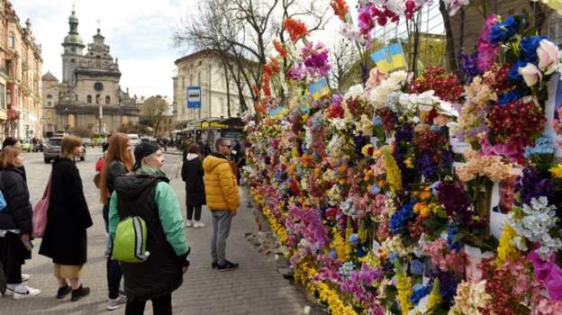 Një homazh me lule për ukrainasit që kanë vdekur gjatë pushtimit rus është ngritur në qytetin perëndimor të Lvivit.