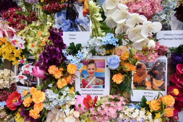Duke përdorur lule artificiale që u dhuruan nga Polonia, memoriali përfshin imazhe të ushtarëve dhe civilëve ukrainas që kanë vdekur që nga fillimi i luftës tre muaj më parë.