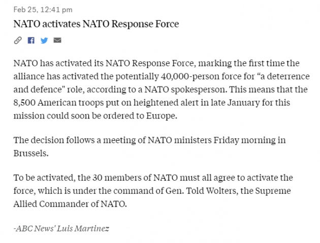NATO ka aktivizuar Forcën e saj të Reagimit, duke shënuar herën e parë që aleanca ka aktivizuar forcën potencialisht prej 40,000 trupash për një rol “parandalues dhe mbrojtje”, sipas një zëdhënësi të NATO-s.