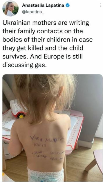 “Nënat ukrainase po shkruajnë kontaktet e tyre familjare në trupat e fëmijëve të tyre në rast se ata vriten dhe fëmija mbijeton”, shkroi gazetarja e pavarur e Kievit, Anastasiia Lapatina, krahas një fotografie nga një familje ukrainase.