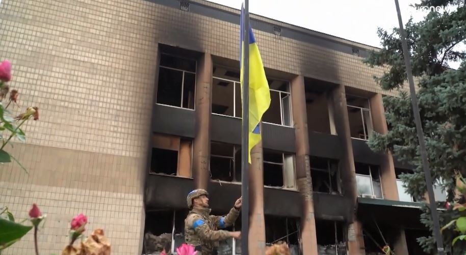 Presidenti i Ukrainës, Volodymyr Zelenskyy, pa teksa ngrihej flamuri i vendit të tij në Izium, një qytet i rimarrë së fundmi.