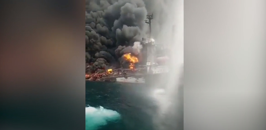 Në pamjet e publikuara në rrjete sociale shihet anija duke u përmbytur përderisa një shtëllungë e dendur me tym të zi ngrihet në qiell. Në video gjithashtu shihet ujë që hidhet mbi anijen e djegur nga një anije tjetër. /arbresh.info/