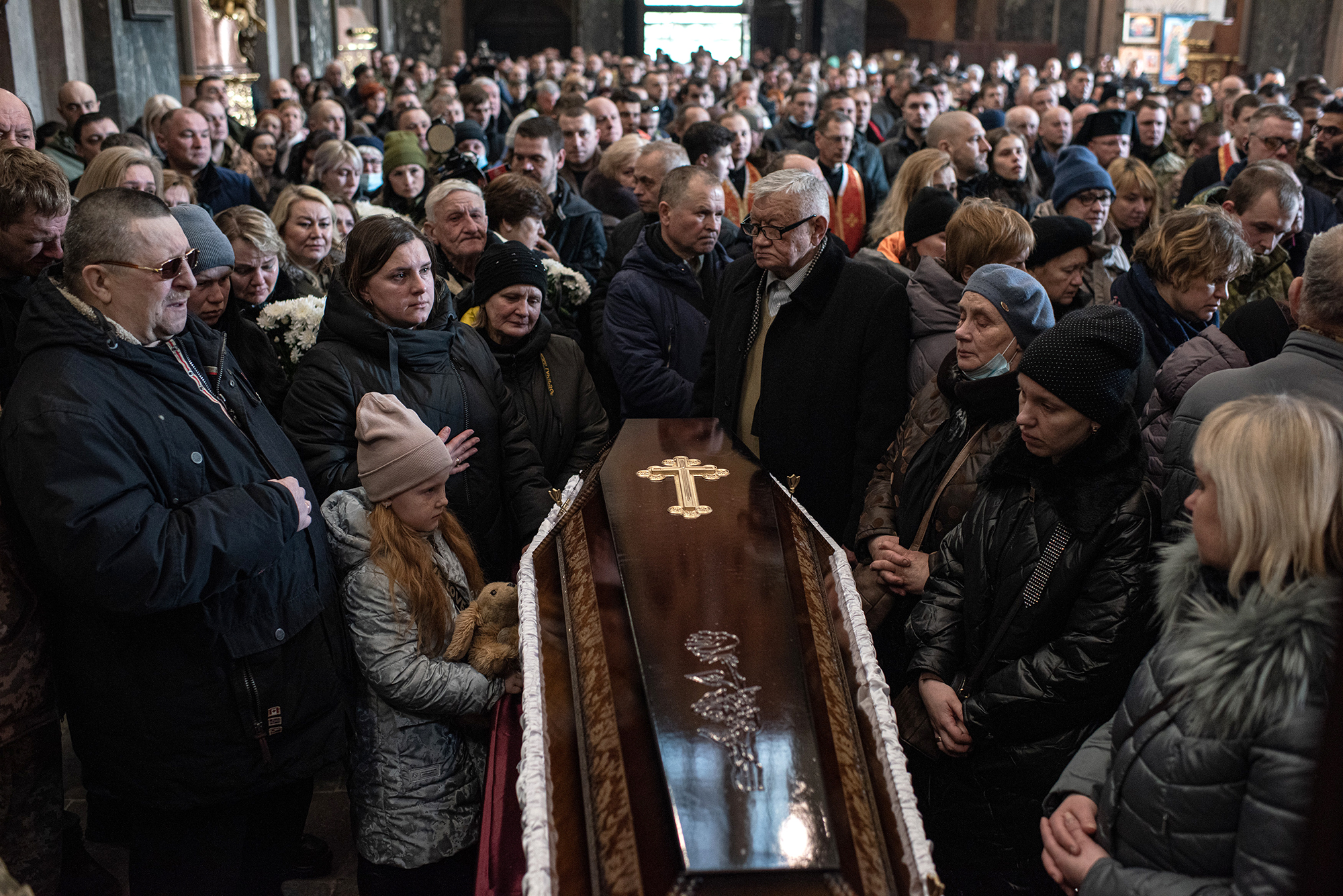 LVIV, UKRAINE - MARCH 15: Close relatives of Rostyslav Romanchuk, including his young daughter, stand by his coffin during the funeral service for Oleh Yaschyshyn, Sergiy Melnyk, Rostyslav Romanchuk and Kyrylo Vyshyvany, on March 15, 2022 in Lviv, Ukraine. The men died in Sunday's airstrike on the nearby International Center for Peacekeeping and Security at the Yavoriv military complex. The barrage of Russian missiles killed 35 and wounded scores. The site, west of Lviv in the town of Starychi, is mere miles from Ukraine's border with Poland. (Photo by Alexey Furman/Getty Images) Relatives stand around the coffin of a Ukrainian soldier on March 15 in Lviv, Ukraine. (Alexey Furman/Getty Images)