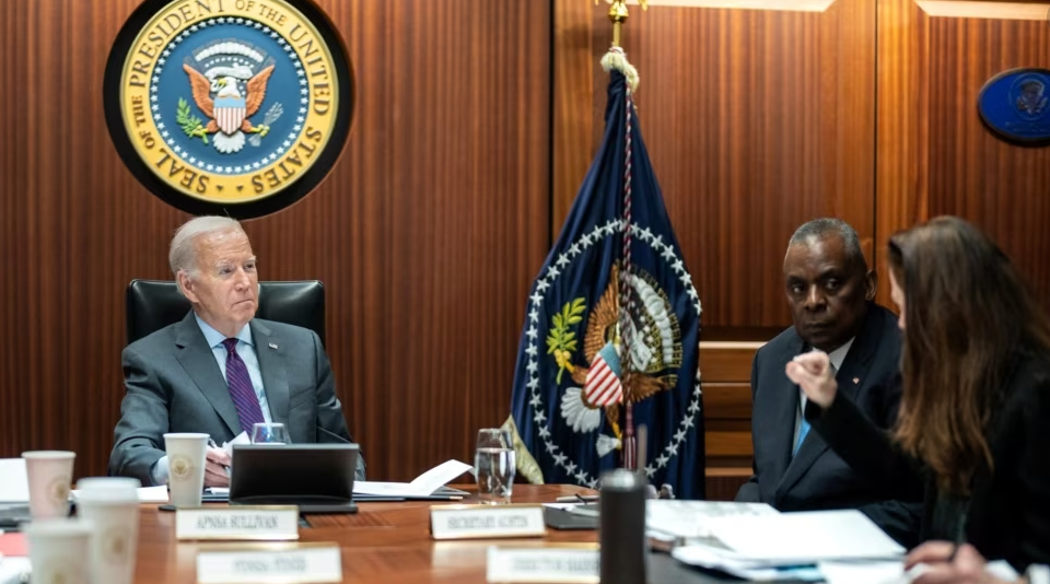 Presdienti amerikan, Joe Biden, informohet për sulmin në Jordani nga drejtoresha e inteligjencës kombëtare, Avril Haines, sekretari i Mbrojtjes, Lloyd Austin, dhe anëtarë të tjerë të ekipit të sigurisë kombëtare. Shtëpia e Bardhë, 29 janar 2024.