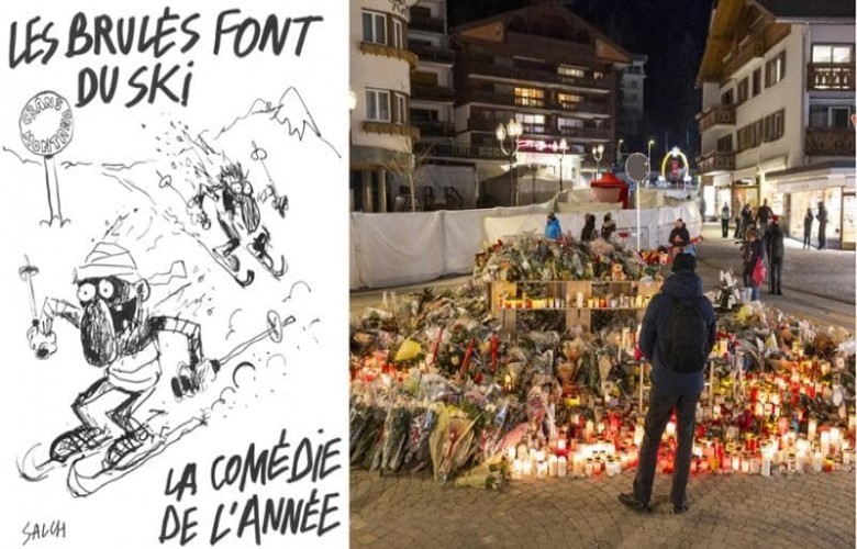 Në vizatim, dy skiatorë me lëkurë të nxirë dhe me fasha zbresin një shpat ku shihet tabela e sinjalizimit “Crans-Montana”, të shoqëruar me mbishkrimet “Të djegurit bëjnë ski” dhe “Komedia e vitit”, në referencë ndaj filmit komik të vitit 1979 Les Bronzés font du ski.