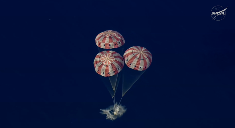 Kapsula u prit në Oqeanin Paqësor nga ekipet e shpëtimit për të nxjerrë ekuipazhin, astronautët amerikanë Reid Wiseman, Victor Glover dhe Christina Koch dhe astronauti kanadez Jeremy Hansen.