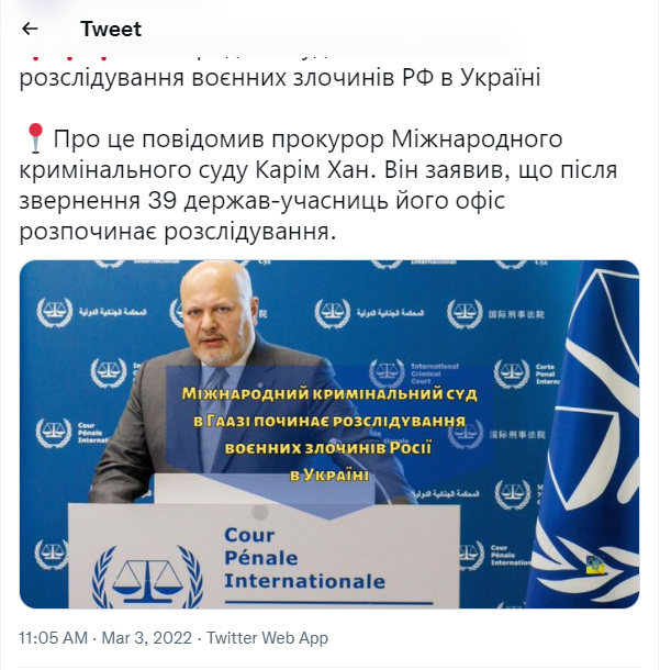 Sipas një njoftimi të Parlamentit të Ukrainës, Prokurori i Gjykatës Penale Ndërkombëtare ka deklaruar se pas kërkesës së 39 shteteve zyra e tij ka filluar një hetim.