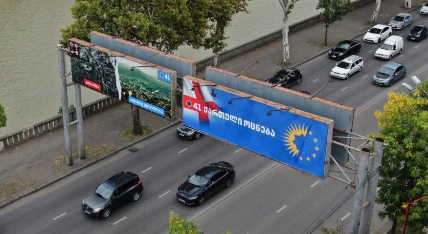 Para zgjedhjeve parlamentare të 26 tetorit, një reklamë e re e fushatës zgjedhore e partisë në pushtet, Ëndrra Gjeorgjiane, vë përballë fotografi bardhezi të Ukrainës së rrënuar nga lufta dhe fotografi me ngjyra të një Gjeorgjie paqësore dhe të begatë.