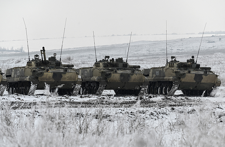 A view shows Russian BMP-3 infantry fighting vehicles during drills held by the armed forces of the Southern Military District at the Kadamovsky range in the Rostov region, Russia January 27, 2022. REUTERS/Sergey Pivovarov