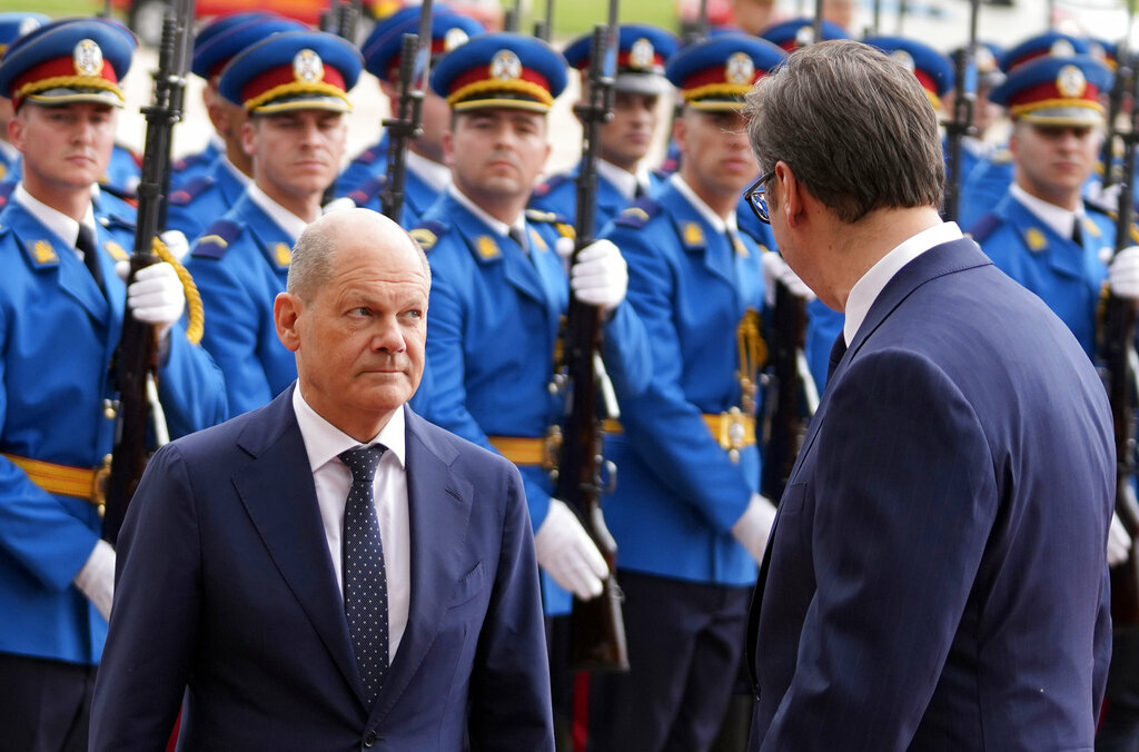 German Chancellor Olaf Scholz, left, reviews the honor guard with Serbian President Aleksandar Vucic during a welcome ceremony before their official talks at the Serbia Palace, in Belgrade, Serbia, Friday, June 10, 2022. Scholz is touring Kosovo, Serbia, Greece, North Macedonia and Bulgaria on his Balkans trip. (AP Photo/Darko Vojinovic)