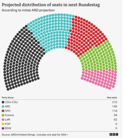 Ne nuk e dimë ende nëse dy nga partitë më të vogla do të hyjnë në Bundestag, e majta populiste BSË dhe FDP liberale janë aktualisht në 0 vende. Por të dyja janë shumë afër pragut 5% që u duhet për të pasur deputetë.